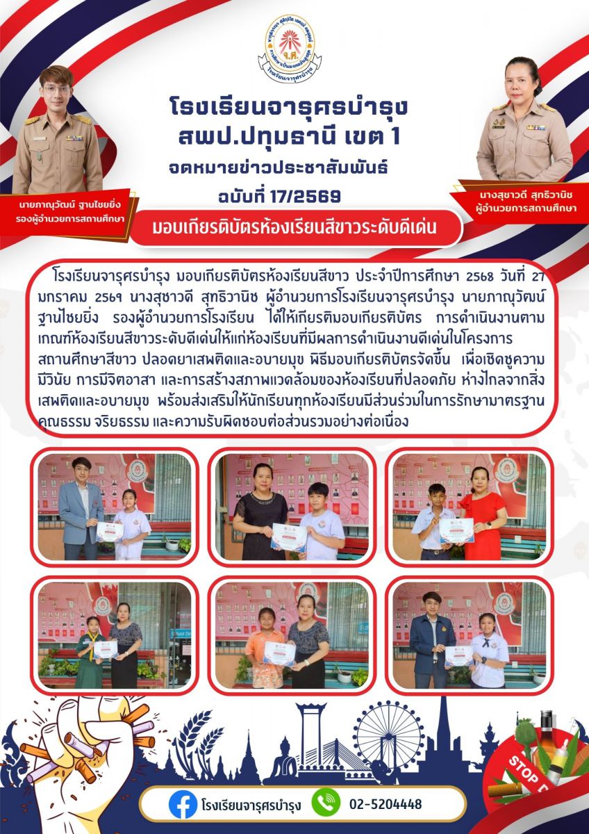 มอบเกียรติบัตรห้องเรียนสีขาวระดับ ดีเด่น